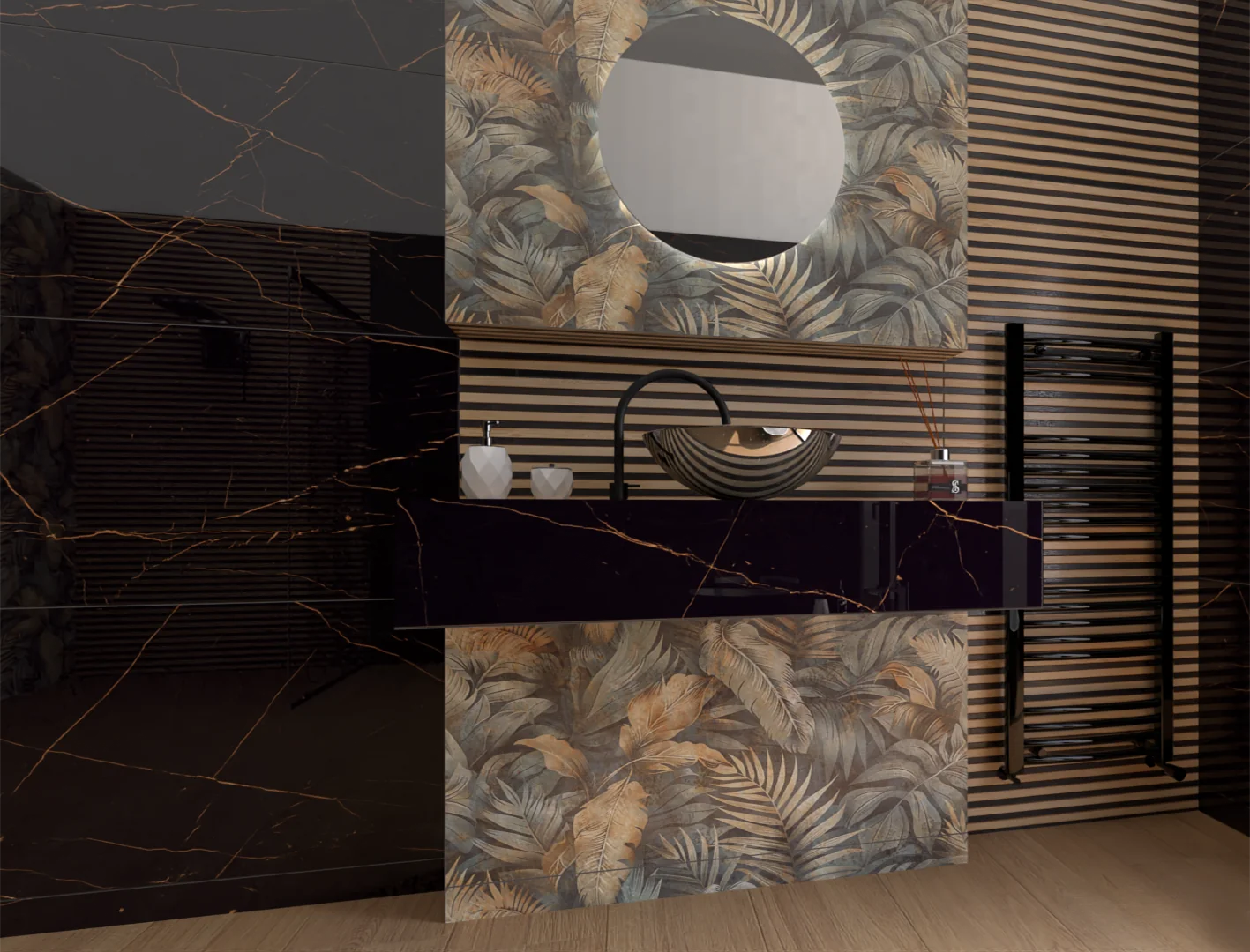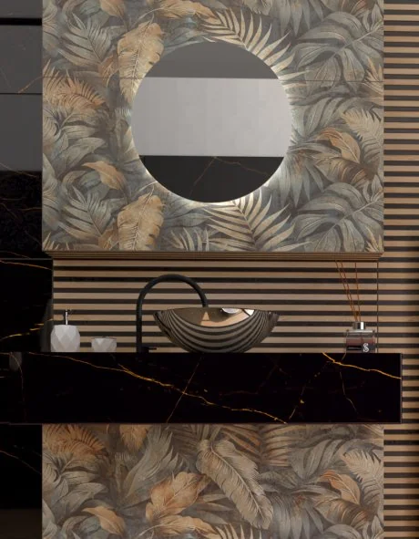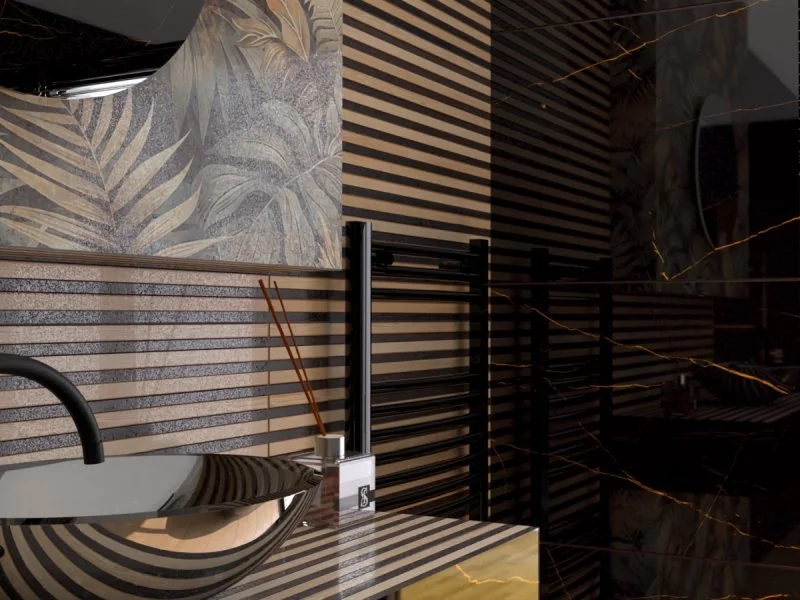 Kolekcja COSMOS BLACK to połączenie głębokiej czerni z eleganckim akcentem miedzi. Lustrzane wykończenie i subtelne metaliczne detale tworzą wyjątkowy efekt luksusu i nowoczesności. Idealna do wnętrz, w których liczy się styl, charakter i ponadczasowa elegancja.