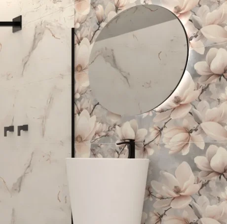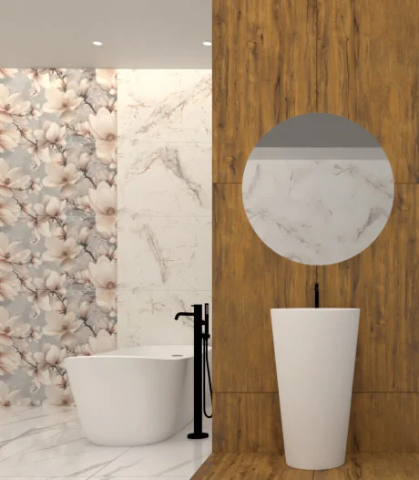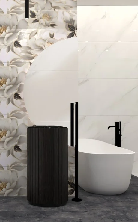 Elegancka płytka inspirowana włoskim marmurem – jasne tło z subtelnymi szaro-złotymi żyłami nadaje wnętrzom lekkości i luksusu. Kolekcja posiada również dekoracje ceramiczne, które umożliwiają tworzenie spójnych, efektownych aranżacji.