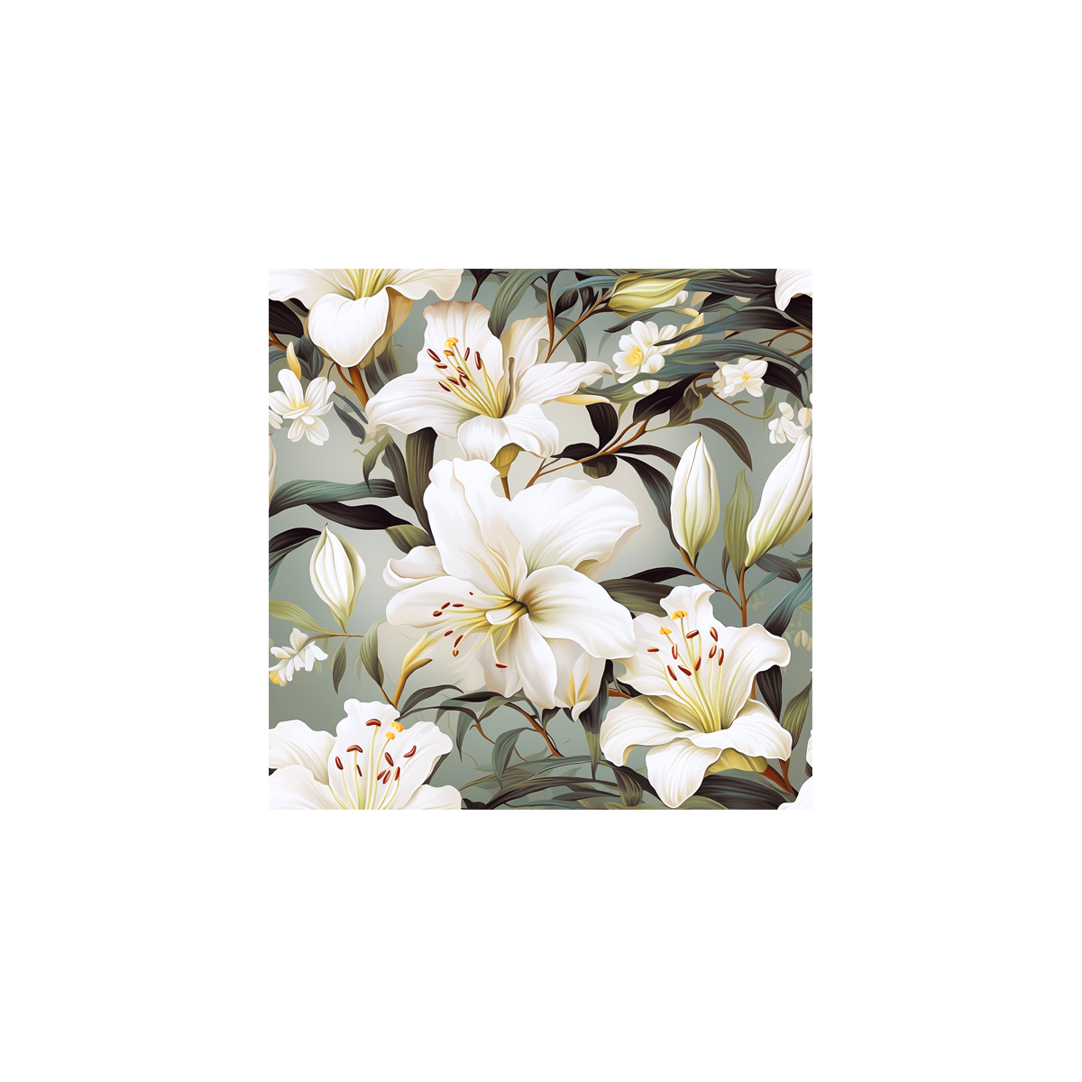 Piękny, delikatny dekor przedstawiający białe lilie — kwiaty kojarzone z czystością, lekkością i ponadczasową elegancją. Jasne płatki kwiatów harmonijnie łączą się z chłodniejszym, szaro-zielonym tłem, tworząc kompozycję, która dodaje wnętrzu świeżości i spokoju.