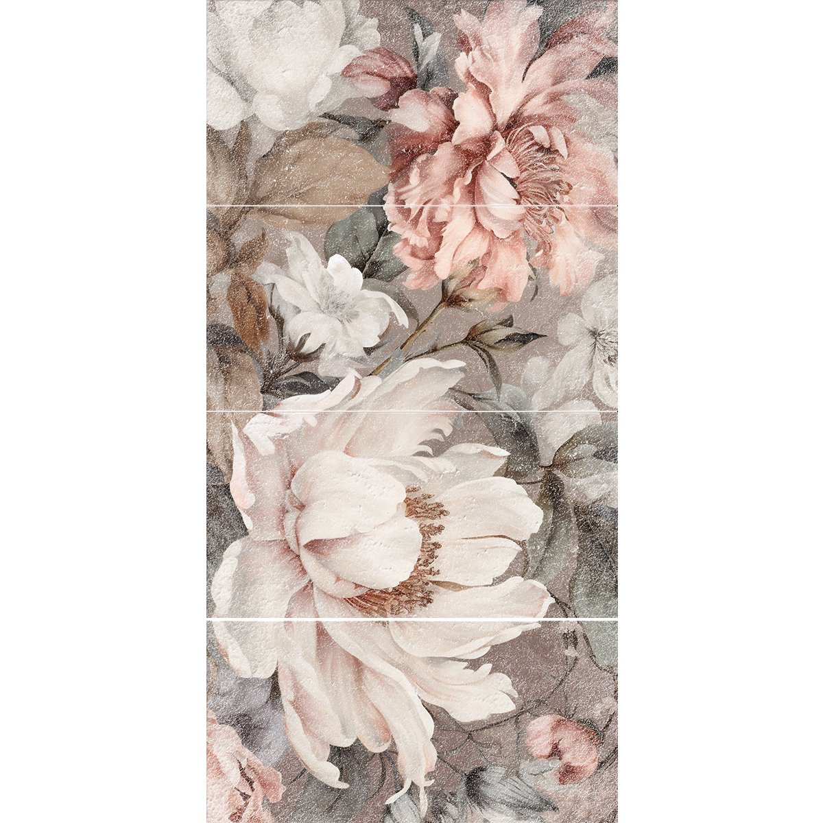 Mural ceramiczny Włoska Elegancja to hołd dla klasycznego piękna i ponadczasowego designu. Inspirowany tradycyjnym malarstwem i delikatnymi kwiatami, ten mural wniesie do każdego wnętrza powiew luksusu i wyrafinowania. To idealny wybór dla tych, którzy cenią subtelną estetykę i artystyczny charakter. Mural Włoska Elegancja wyróżnia się niezwykle malarskim stylem i bogactwem faktury. Realistyczne detale kwiatów peonii w odcieniach pudrowego różu, beżu i szlachetnej bieli harmonijnie łączą się z tłem o postarzanej, lekko spękanej strukturze w kolorach brązu, szarości i écru. Ten wzór przypomina fresk, nadając wnętrzu unikalny, historyczny charakter.