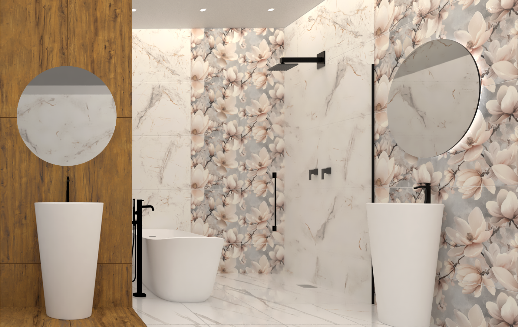 Dekor idealnie sprawdzi się jako centralny element aranżacji w łazience, salonie kąpielowym lub sypialni, wprowadzając atmosferę spokoju, świeżości i luksusu. Satynowe wykończenie nadaje powierzchni subtelny połysk, który pięknie odbija światło, podkreślając naturalny urok kwiatowych motywów.