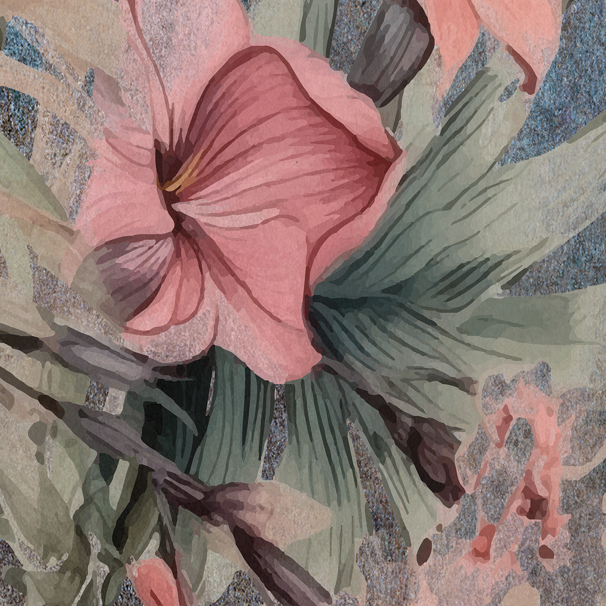 Mural TROPICO zachwyca subtelnością i bogactwem detali. Delikatne, malarskie pociągnięcia pędzla na postarzanym tle nadają mu charakteru vintage. Wzór łączy soczyste, zielone liście i wyraziste, różowe kwiaty hibiskusa, tworząc intrygujący kontrast.