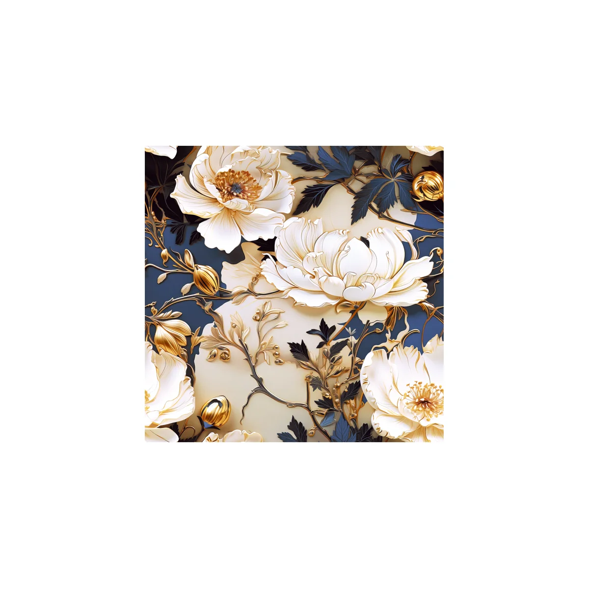 Ekskluzywny dekor inspirowany piwoniami – symbolem elegancji, dostatku i subtelnego piękna. Duże, pełne kwiaty w odcieniach bieli i kremu zostały podkreślone złotymi akcentami, które nadają całości szlachetny, biżuteryjny charakter. Granatowo-złote tło tworzy efekt głębi i wyjątkowego kontrastu, dzięki czemu dekor staje się centralnym punktem każdej aranżacji.